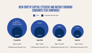 This evolution in consumer behavior has fundamentally altered the growth trajectory for a new wave of consumer tech companies. Unlike their predecessors who needed massive capital before seeing meaningful revenue, today's startups can get there much earlier in their journey and that too with much less capital invested. Companies like PocketFM, AstroTalk, Seekho, and FRND exemplify this—they've been able to scale up rapidly in a capital-efficient manner and unlock large revenue pools.