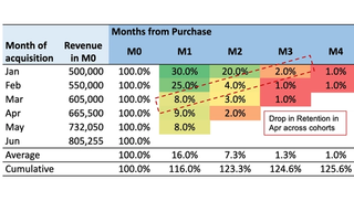 In this table, we can see that customers acquired in January fetched a revenue of INR 5 lakh in the first month. The M1 retention of 30% for Jan cohort indicates that these customers spent ~INR 1.5 lakh (30% of INR 5 lakh) in Feb and so on.